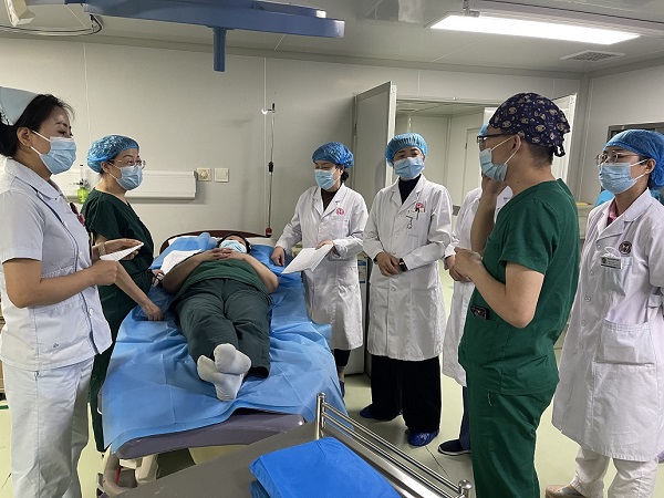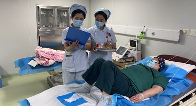 随后,一场惊心动魄的羊水栓塞急救演练正式开始。场景呈现为正在产房待产的36岁经产妇王红突然出现咳嗽、胸闷、血压、血氧下降的情况。一线医师判断有可能是羊水栓塞,立即对产妇采取面罩吸氧、开放静脉通路、心电监测措施并呼叫二线主治医生赶往产房....